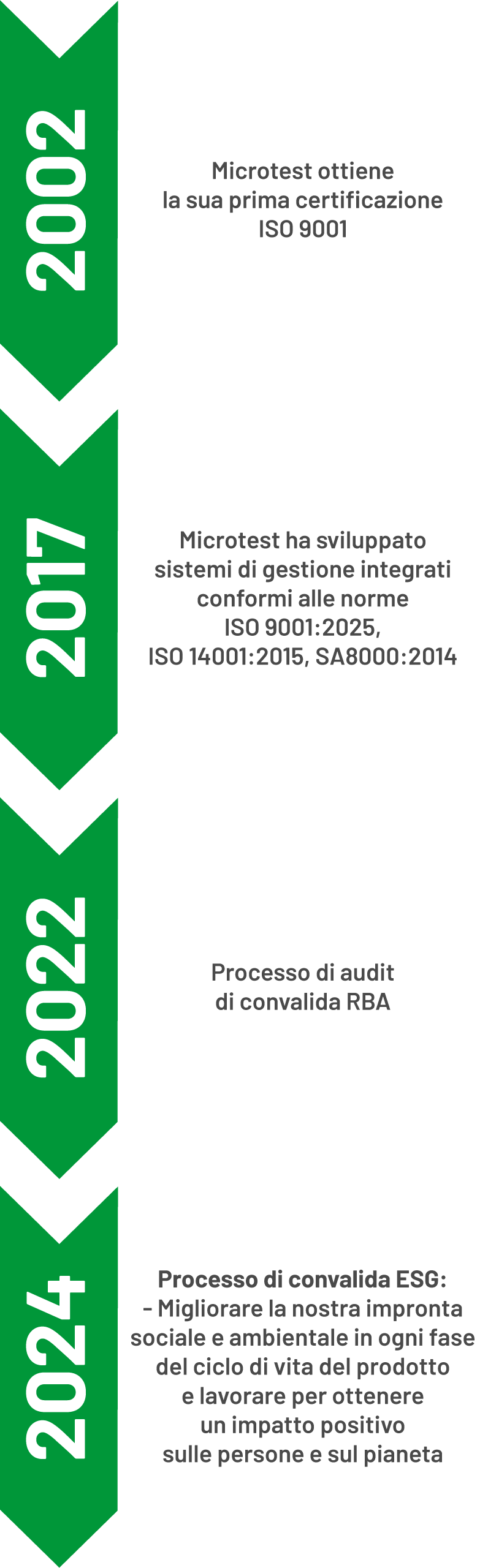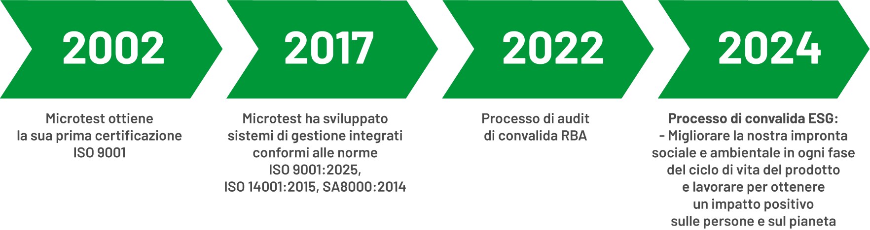 In Microtest riconosciamo che gestire efficacemente le nostre attività, specificamente nel contesto ESG, significa espandere la nostra supervisione e le nostre politiche oltre i confini del nostro gruppo, includendo anche i principali stakeholders all’interno della nostra catena di approvvigionamento. A tal fine, per garantire che i nostri fornitori aderiscano a elevati standard di condizioni di lavoro sicure, trattamento equo e rispettoso dei dipendenti e pratiche etiche, abbiamo emesso un Codice di Condotta per i Fornitori e ci siamo uniti alla Responsible Business Alliance (RBA).