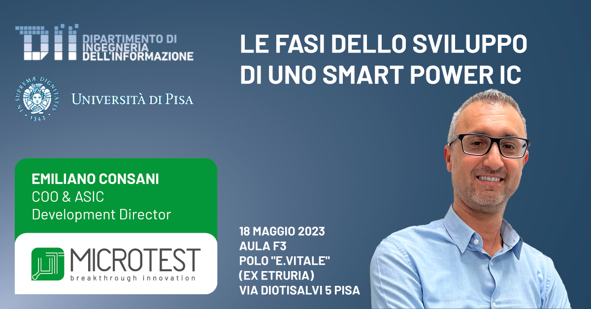 Emiliano Consani, COO e ASIC Development Director di Microtest, sarà il relatore di un seminario dal titolo “Le fasi dello sviluppo di uno Smart Power IC: dalla definizione della specifica alla completa maturità del dispositivo seguendo l’approccio integrato del “Design for X”.